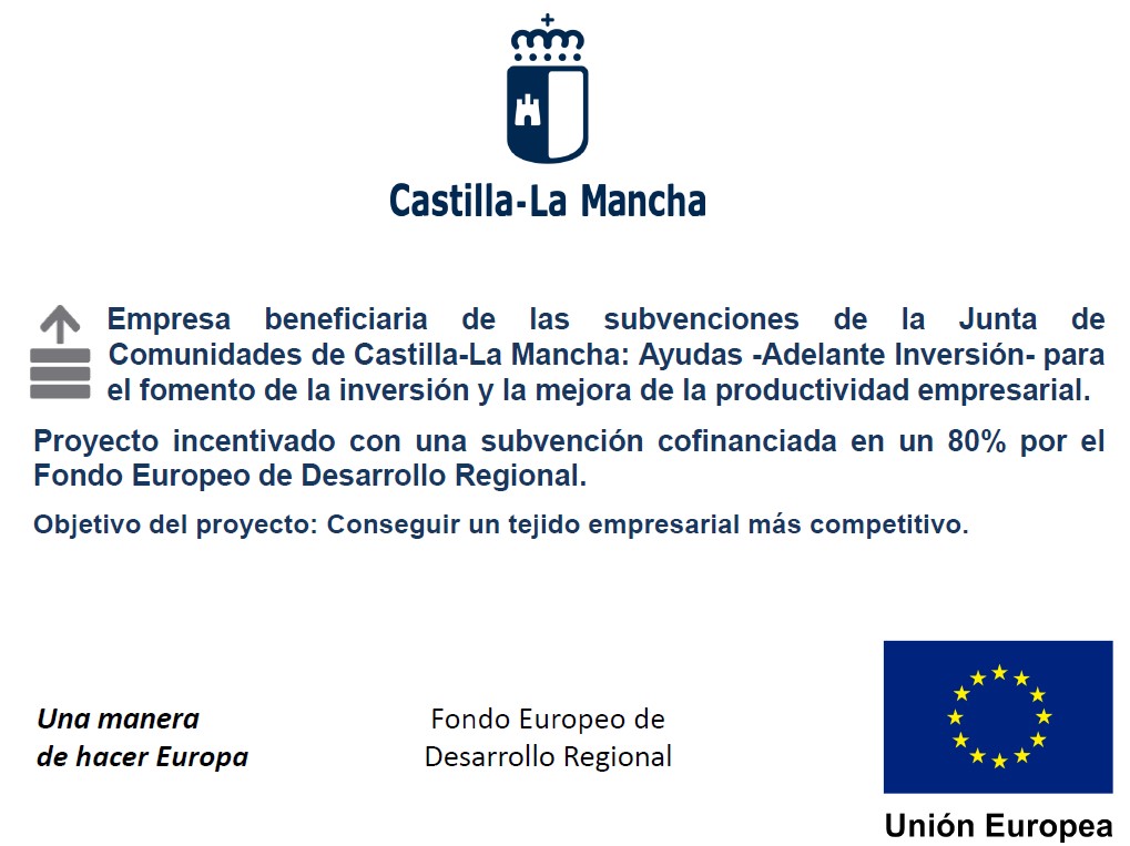 Dicha instalación ha sido posible gracias a las AYUDAS PARA EL APROVECHAMIENTO DE LAS ENERGÍAS RENOVABLES EN CASTILLA-LA MANCHA cofinanciadas por el FONDO EUROPEO DE DESARROLLO REGIONAL del año 2019 para conseguir una economía más limpia y sostenible.