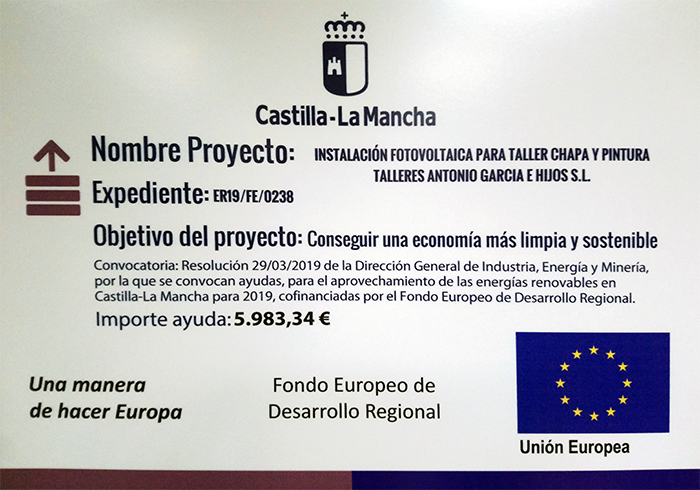 Dicha instalación ha sido posible gracias a las AYUDAS PARA EL APROVECHAMIENTO DE LAS ENERGÍAS RENOVABLES EN CASTILLA-LA MANCHA cofinanciadas por el FONDO EUROPEO DE DESARROLLO REGIONAL del año 2019 para conseguir una economía más limpia y sostenible.